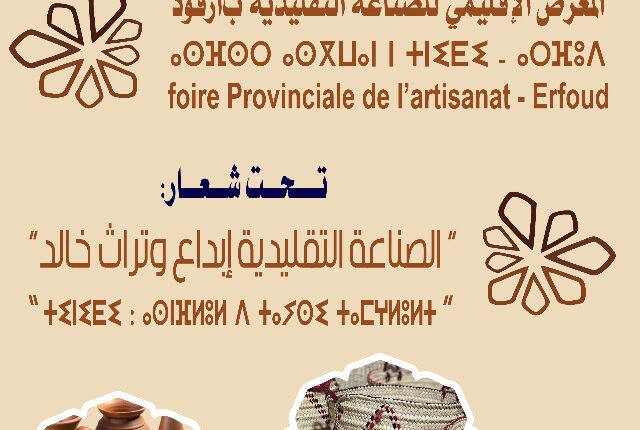 في إطار فعاليات الملتقى الدولي للتمر ، تحتضن مدينة أرفود من 29 أكتوبر إلى 2 نونبر 2025، فعاليات المعرض الإقليمي للصناعة التقليدية، الذي تنظمه غرفة الصناعة التقليدية لجهة درعة تافيلالت، بتنسيق مع المديرية الإقليمية للصناعة التقليدية والاقتصاد التضامني والاجتماعي بالرشيدية، وبشراكة مع الجماعة الترابية لأرفود، تحت شعار: “الصناعة التقليدية… إبداع وتراث خالد”.